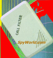 Filter Call Filter The new Call Filter is the ultimate privacy device for your telephone line. It allows only callers with a pass code to get through. The Call Filter Greets the caller asking them to enter the pass code (via touch tone phone). Only Callers with the correct pass code (that you have given them) will be able to ring through. If they don't have the code, your phone will not ring !. The Call Filter is plugged between the wall jack and your Telephone. Codes can easily be changed by adjusting the switches on the back of the unit. Lithium battery included that will last for approximately 4 years. Dimensions: 6.5" x 4.25" x 2.5" For the latest selection click here